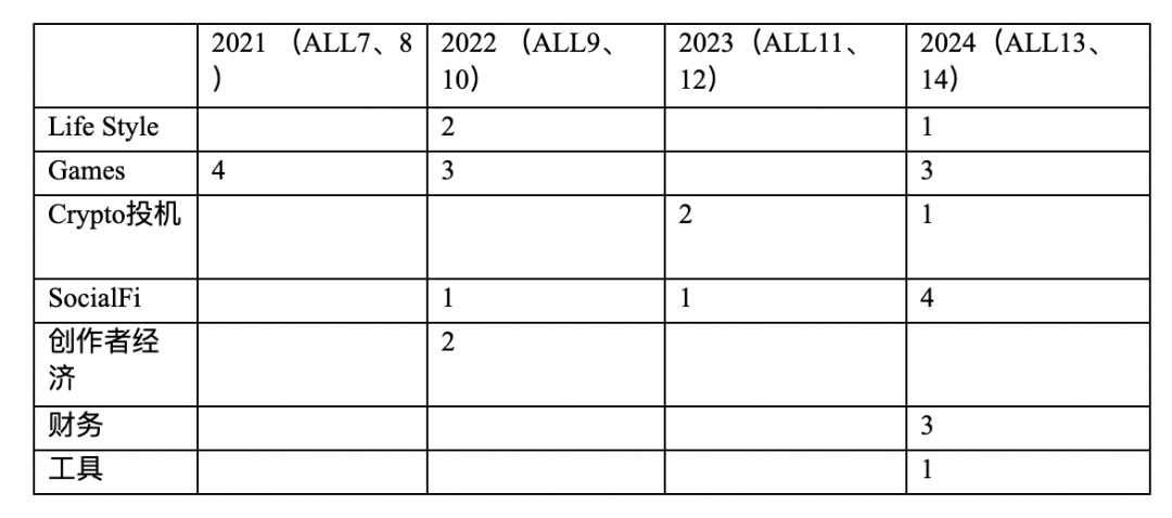 从投资偏好的发展趋势来看,Alliance DAO从2021年开始对Consumer类项目的投资与孵化,在2021~2023上半年,其主要投资与孵化方向侧重于Games和创作者经济类项目。自2023年下半年开始直到2024年,其偏好切换为Crypto投机类、SocialFi类以及财务类。