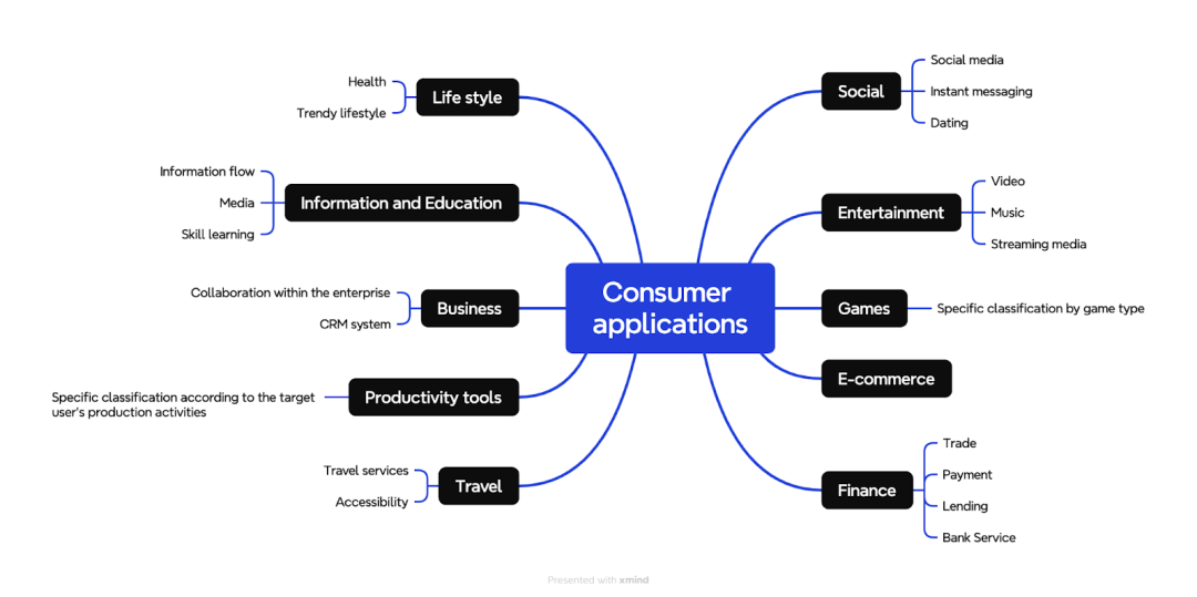 通常情况下,按照大多数App Store中的分类,我们可以将整个消费者应用赛道大致分为以下10个类别,并且每个类别又会有不同的细分。当然随着市场的成熟,很多新型产品为找到各自的差异性卖点,都会在一定程度上组合多个特征,不过我们仍可以按照各自的核心卖点做简单的归类。
