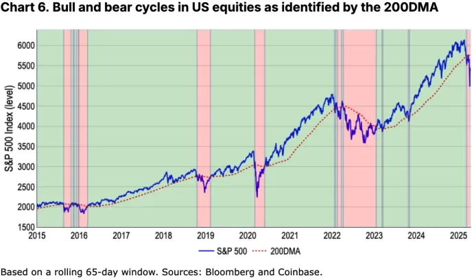 当价格长期低于 200 DMA 且伴随下行动能时,往往意味着熊市的形成。