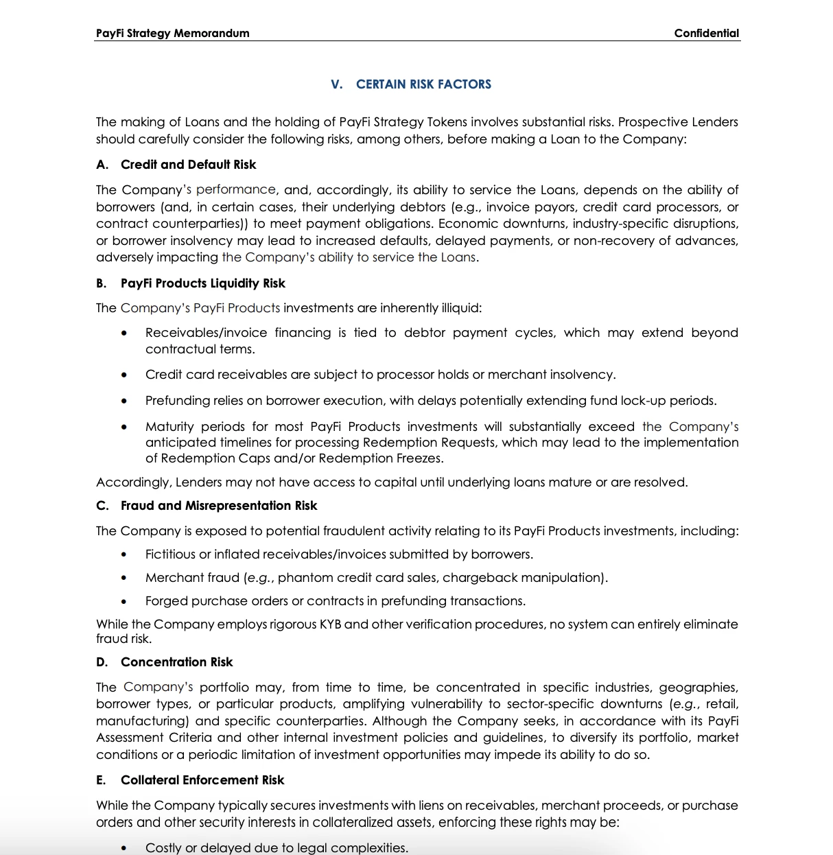 根据 Huma 官方提供的 PayFi 策略备忘录文件 相关信息来看,Huma 主动披露了一系列的风险因素,其中包括: