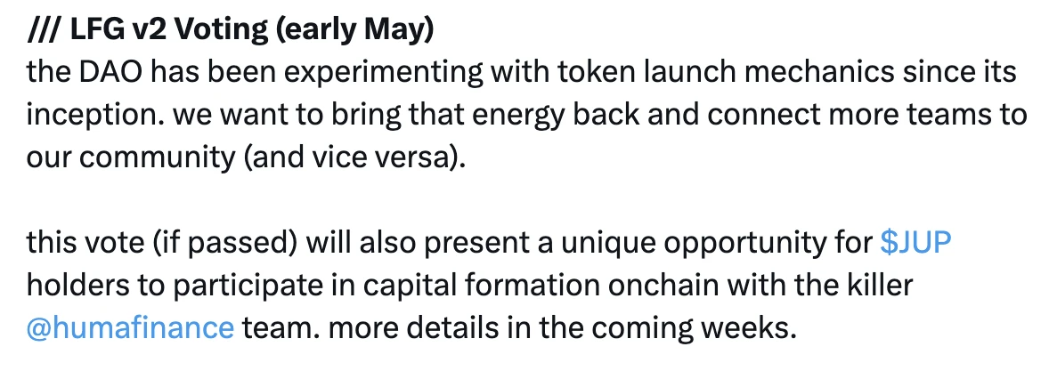 2025 年 1 月,据 第三方消息 ,Huma 将在 Jupiter LFG Launchpad 上推出 HUMA 代币,预计投票发布时间为 5 月。