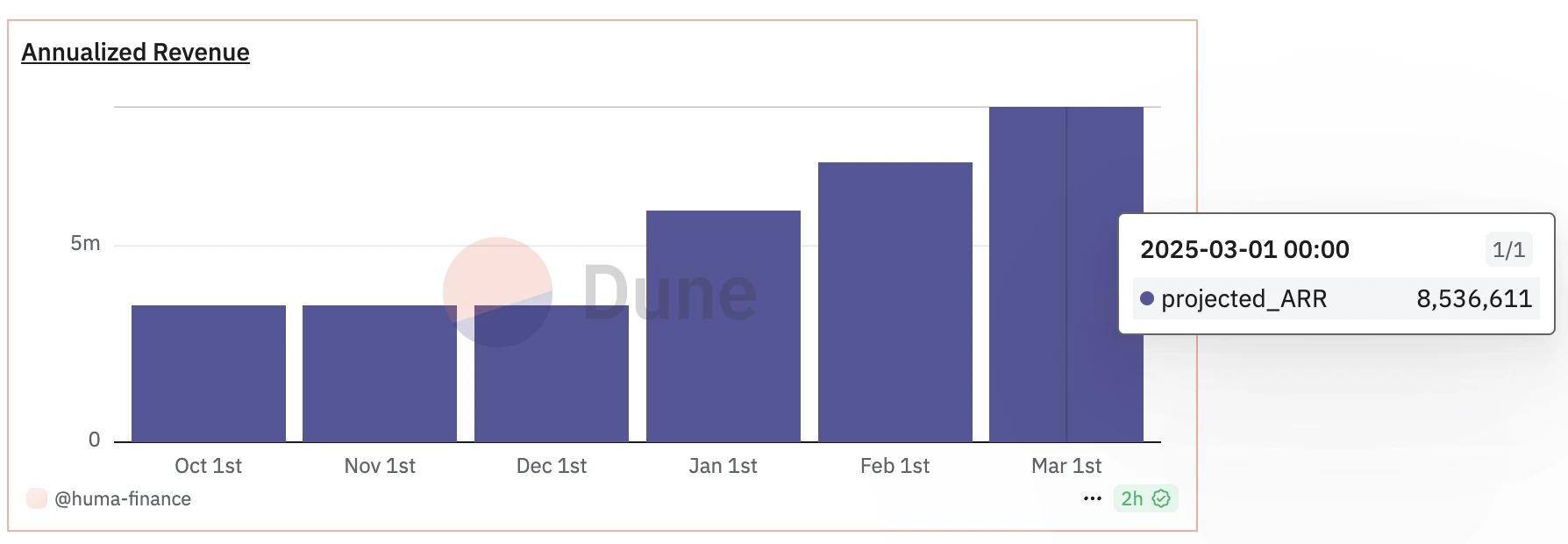 此外,对于用户最为关心的年化收入,据 Dune 数据,Huma 的平台年化收入自去年 10 月以来呈逐步增长态势, 2025 年 3 月年年化收入高达 853.6 万美元。而上线不足一周的 Huma 2.0 目前累计存款额已突破 1221 万美元。