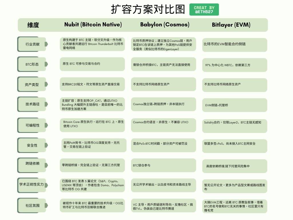 Babylon 和 Bitlayer 都有各自的原生代币,这些代币充当着支付手续费或治理的功能。一部分生态价值被这些新代币捕获, 摊薄了 BTC 作为唯一价值载体的地位。 比如 Babylon 的用户更关注 BABY 代币价格和收益,而不是 BTC 本身价格;Bitlayer 上运行 DeFi,可能带火的是其链上的合约代币和治理币,而 BTC 仅仅作为抵押物存在。长远看,如果比特币的创新红利被其他代币拿走,对于纯 BTC 投资者而言并不理想。原生扩容方案则一切应用都直接使用 BTC 作为计价和结算资产。无论发行代币、NFT 还是运行去中心化应用,底层消耗的都是 BTC。BTC 的需求随着应用繁荣而上升,BTC 持有者受益于此生态增长。
