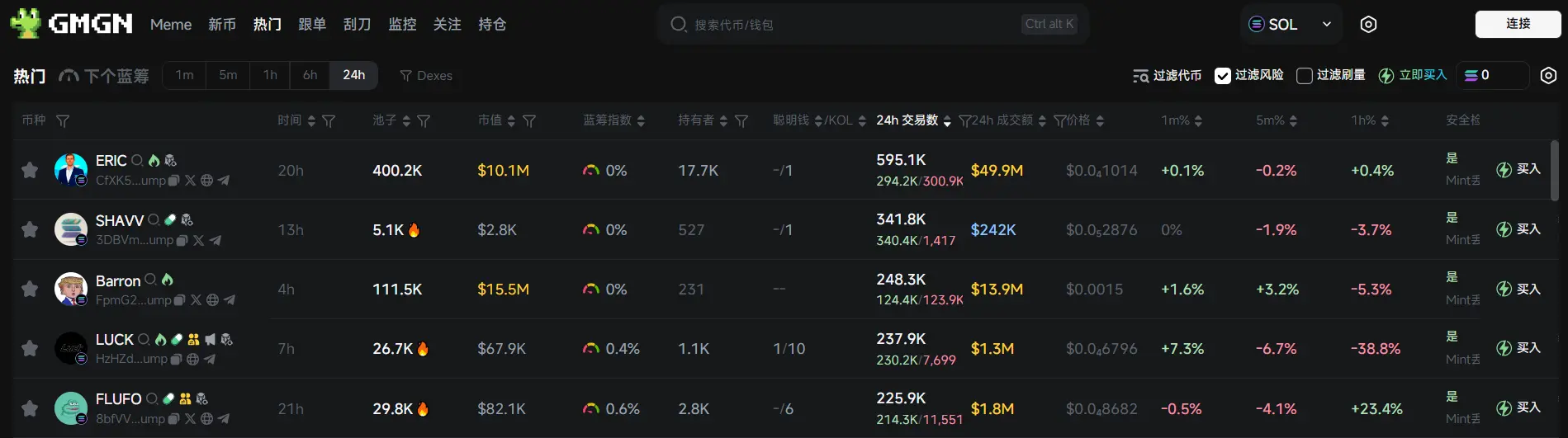 过去 24h Solana 热门代币前五依次为:ERIC、SHAVV、Barron 、LUCK、FLUFO