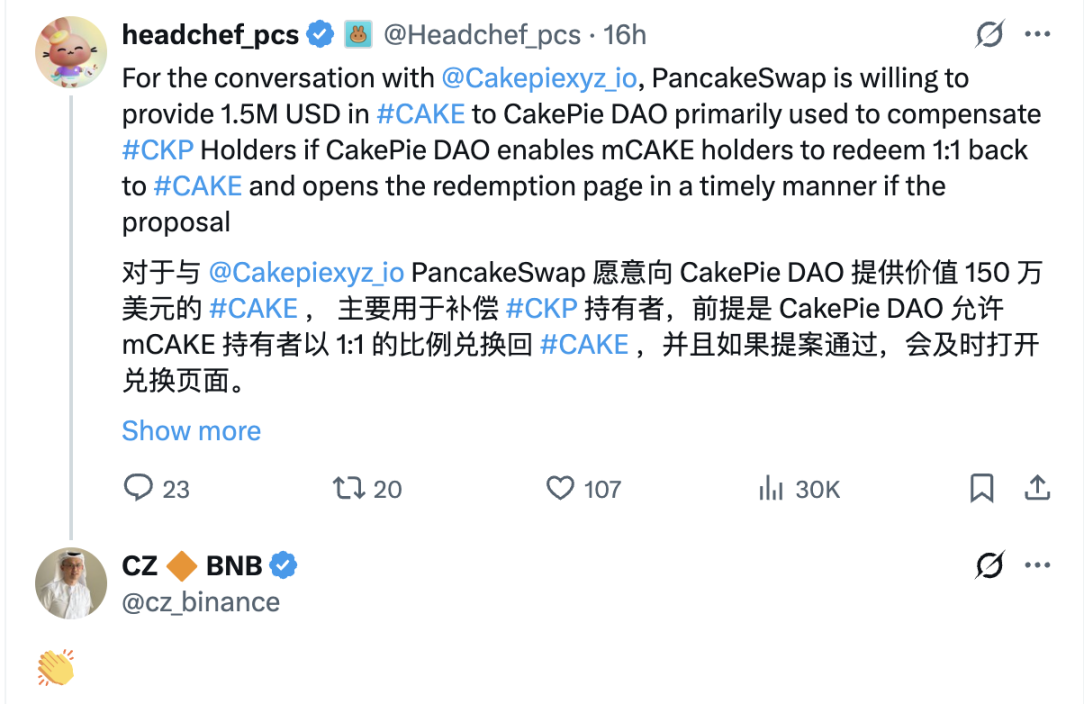 4 月 16 日,PancakeSwap 官方成员透露,他们正在与 Cakepie DAO 进行密切沟通,并愿意提供 150 万美元补偿 CKP 持有者,该贴文得到了赵长鹏的鼓掌回复。但 CKP 即使在暴跌之后 FDV 仍然超过 1000 万美元,流通市值 400 万美元也高于 150 万美元的补偿金额。