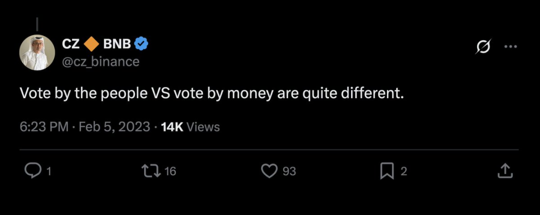目前提案投票已正式上线,支持方已 70% 以上的得票占据优势。而即使 Cakepie DAO 与散户不支持该提案,似乎也无法与占据 50% 投票权的最新锁仓的「巨鲸」相抗衡。赵长鹏曾在 2 年前表示「让群众投票和让资本投票是不一样的。」但这一次,他好像站到了资本的一边,成为了凭借资本优势,一句话决定社区项目生死的那个人。