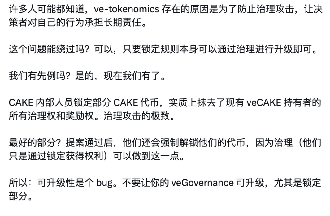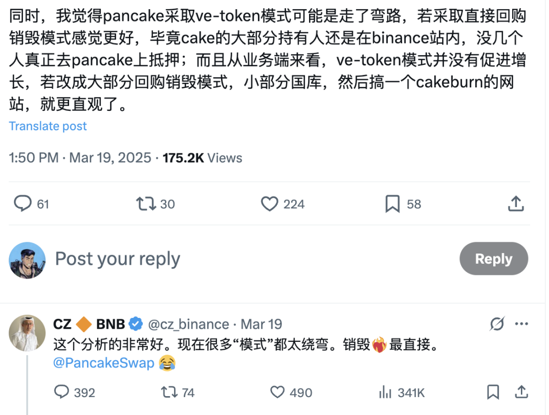 3 月 19 日,某业内人士在 X 上表示,PancakeSwap 代币 CAKE 现行 veCAKE 锁仓机制设计过于复杂,不仅增加了用户参与门槛,也让长期治理权与短期激励之间的平衡出现了偏差。币安联创赵长鹏在 X 平台的评论中赞同「PancakeSwap 应采用回购销毁模式替代 ve-token 模式」观点,并表示「现在很多『模式』都太绕弯,销毁最直接。」并 @ PancakeSwap 官方。