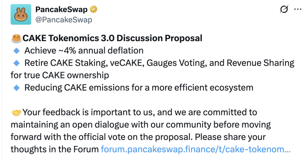 4 月 8 日,PancakeSwap 在 X 上宣布其 CAKE 代币经济学 3.0 提案,此举意在对 CAKE 代币的发行、通胀机制以及治理模式进行全面重构。
