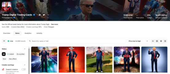 2022年12月15日,特朗普通过他创立的社交媒体网站TruthSocial宣布发行特朗普数字交易卡NFT,该系列在Polygon区块链上铸造,初始创建了总共4.5万个NFT,起始价格为每件99美元,购买45张数字交易卡,将获得一张与特朗普共进晚餐的门票。该系列NFT可支持信用卡和WETH购买,需要KYC和邮箱,尽管在当时引发群嘲,但在前总统的流量加持与号召下,这一系列仍然在推出后不到一天就宣告售罄。从opensea的交易量来看,这一系列交易总量达到17,115ETH,目前有14411个持有者。