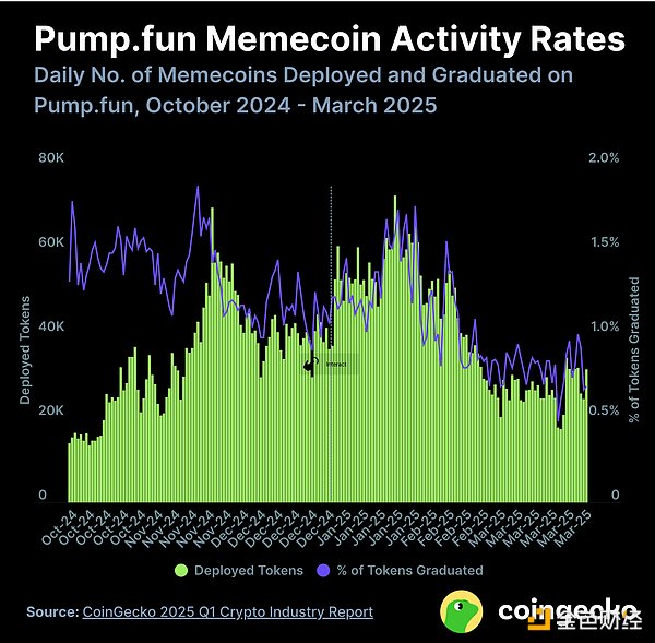 此后,Pump.fun 上的活动显著下降,每日部署的代币数量从 1 月份的峰值下降超过 -56.3%,至 2025 年第一季度末的 3.1 万个。「毕业」代币的比率也从 1 月份的 1.4% 下降至本季度末的 0.7%。