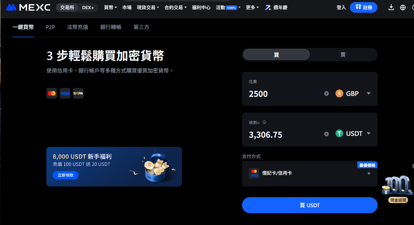 MEXC 提供多种法币入金选择,包括信用卡、银行转帐与 Apple Pay。平台与第三方支付处理商(如 Simplex、Banxa、Mercuryo)合作,让用户可直接用 Visa 或 MasterCard 购买比特币,流程快速且安全。
