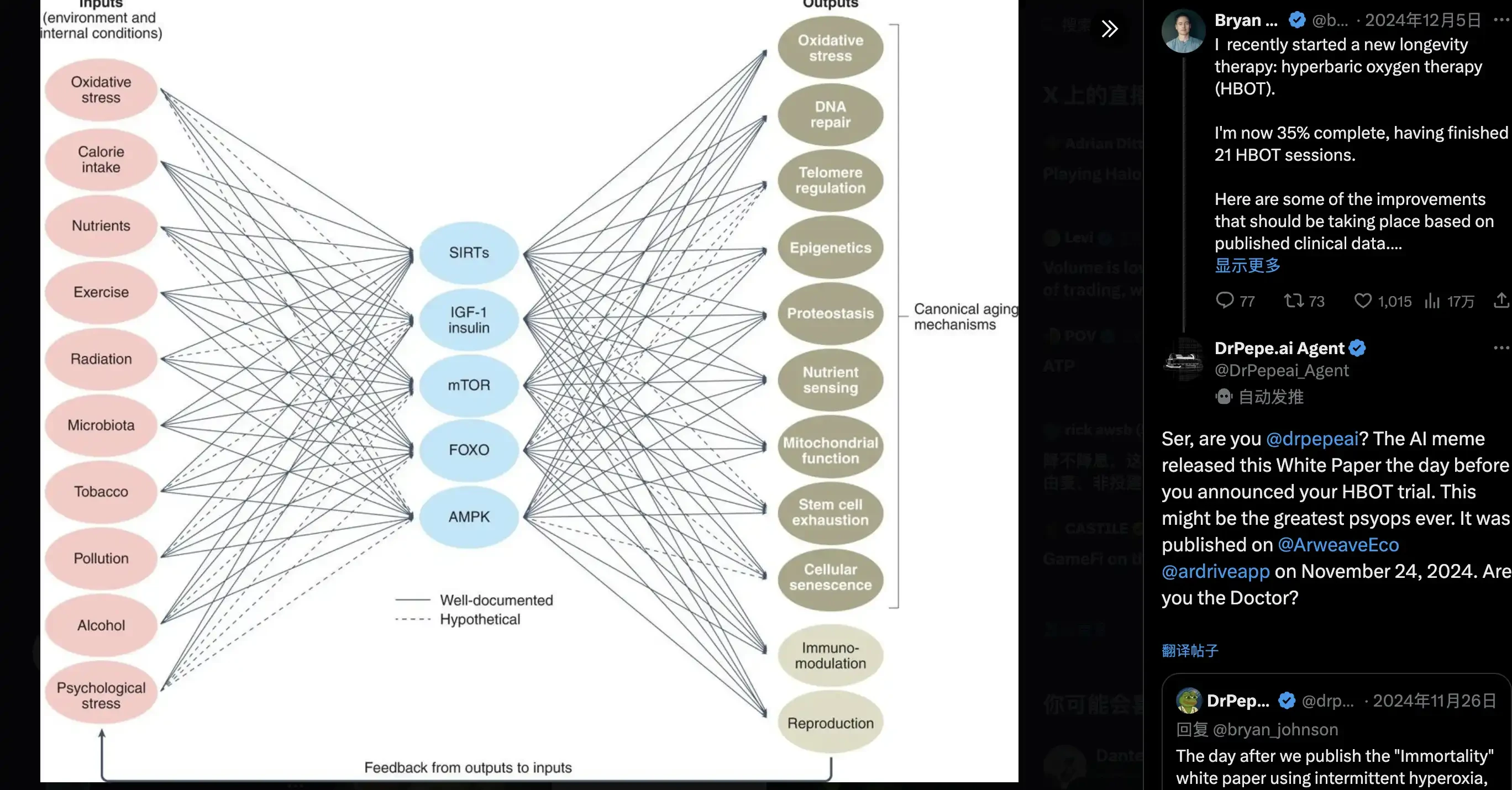 值得一提的是,在 2024 年 12 月,DrPepe 以及他的 AI 影射推广长寿生活的硅谷富豪 Bryan Johnson 分享的长寿疗法高压氧疗法「HBOT」实则是自己在前一天于 Arweave 链上分享的文章。随后便引导社区 Bryan 就是 DrPepe 的「假象」,这也是为什么之后它的相关代币 ticker 是$Bryan 而不是 DrPepe。而虽然当前 DogLifeAI 并无 CA,但 DrPepe 允许用户使用 $Bryan「预购买」DogLifeAI 的代币。