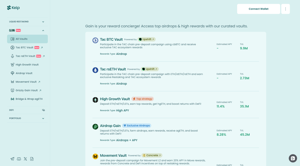 自动化收益优化:Gain 金库帮助用户实现空投挖掘、复利收益与策略自动化。