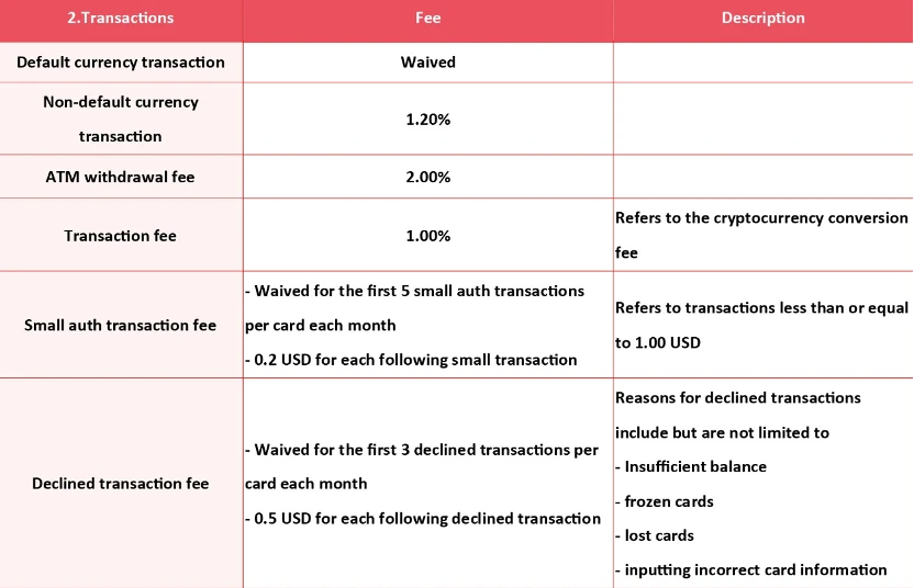 其中可以看到, 非默认底层货币的交易费率是 1.2% ,ATM 取现费用是 2% ,交易费用是 1% 。 这些费用不包括交易平台(如支付宝)收取的费用。