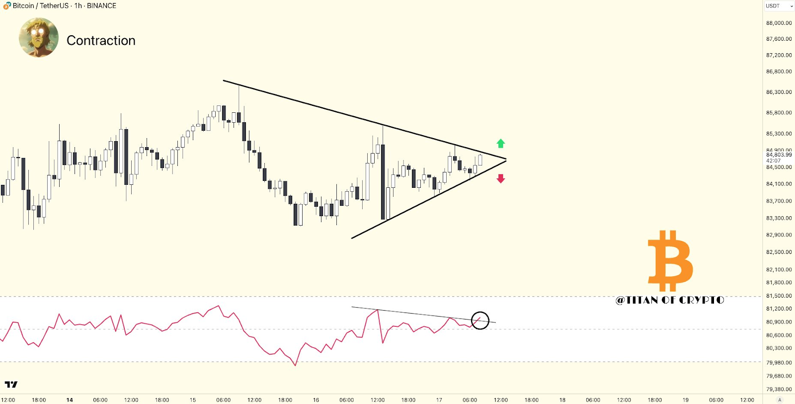从技术面看,比特币正处于关键「拐点」。匿名交易员 Titan of Crypto 指出,BTC 价格在三角形形态内持续收缩,RSI 指标位于 50 上方并试图突破阻力位,暗示方向性突破即将到来。订单流分析师 Magus 则认为,若比特币无法尽快突破 85,000 美元,长期图表可能转向看跌。这一价格区间的争夺,不仅关乎短期趋势,更可能决定比特币能否延续 2024 年以来的牛市格局。