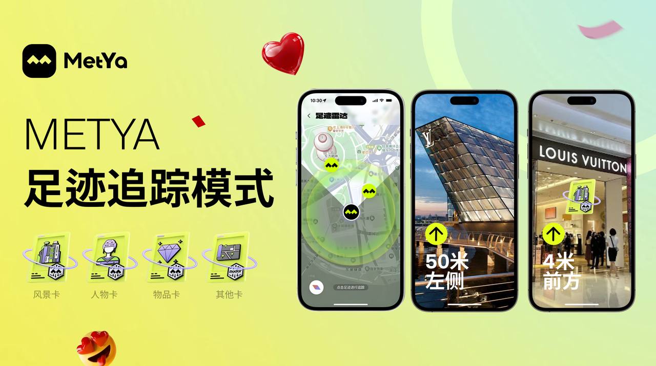 Metya 还推出了“ME 足迹”功能,利用 AR 技术和地理定位,帮助用户在城市中进行社交探索。通过雷达功能,用户可以查看附近其他用户留下的足迹,进入“追踪模式”,根据 AR 箭头的指引找到足迹所在位置。每个足迹卡片不仅记录了社交互动内容、图片及评论,还允许用户与其他拾取到该卡片的用户共同创作。用户可以留言、绘画或进行其他形式的互动,增加社交的创意与趣味。