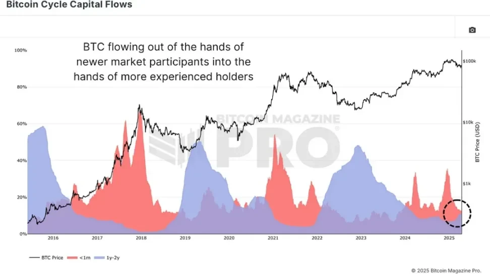图3:比特币周期资本流动图表展示了BTC正回流到更有经验的持有者手中