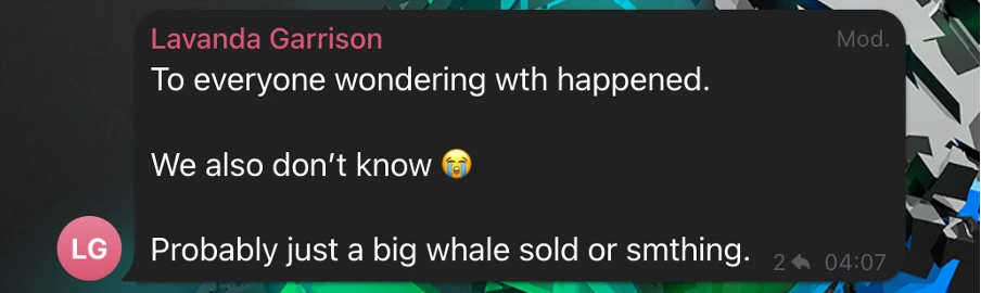 4 月 19 日凌晨 4: 07 ,社区贡献者 Lavanda Garrison 在 Telegram 官方社群中表示,社区接管团队(CTO)尚未明确闪崩的原因,怀疑可能是某个大户出货所致。
