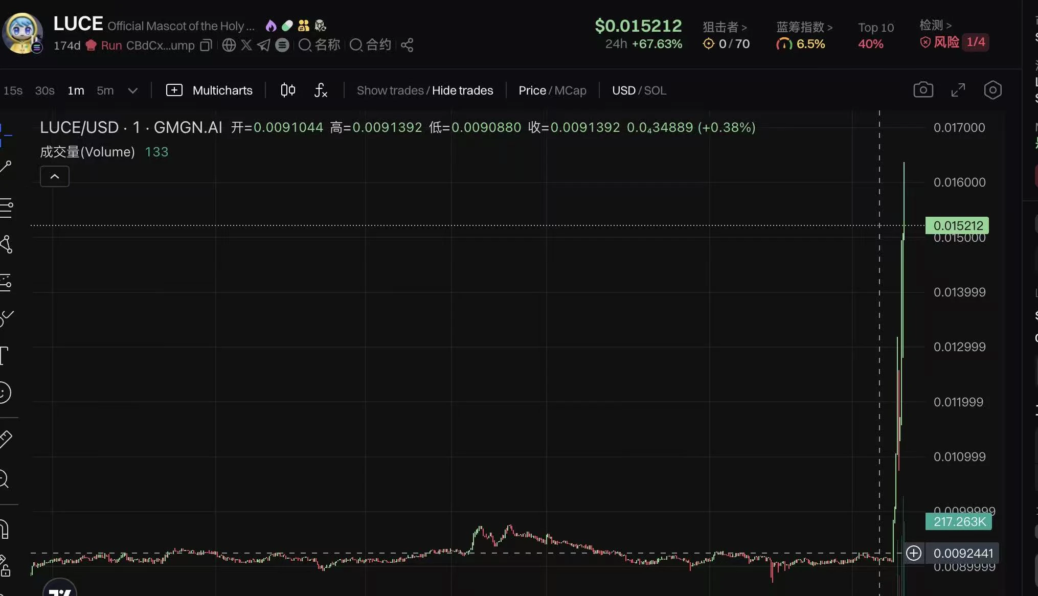 开发者(Dev)借势将宗教情怀转化为资本叙事,仅用 2 枚 SOL(约 130 美元)创建代币,并在 Pump.fun 平台上线。代币供应量为 10 亿枚且全流通。次日,LUCE 市值在 12 小时内飙升至 5300 万美元,交易量突破 1.16 亿美元。链上数据显示,Dev 以 2.73 枚 SOL 抛售 6706 万枚 LUCE,获利 0.73 枚 SOL(约 130 美元),但此时代币的市场价值已突破 200 万美元,露出早期控盘的迹象。