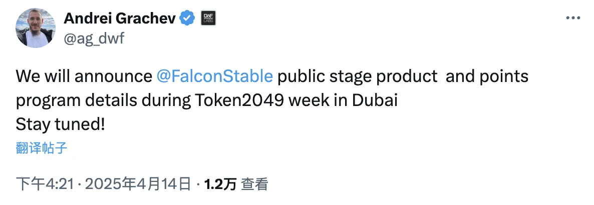 DWF Labs 合伙人 Andrei Grachev 表示,该机构旗下稳定币 Falcon Finance 将在迪拜 Token 2049 期间发布公测产品,并公布积分计划详情。