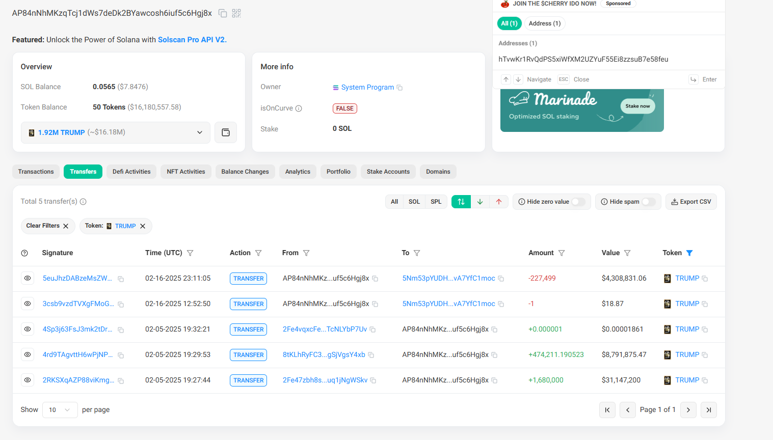 另一个大户,3AWDTDGZiW8joyfA52LKL7GUWLoKBCBUBLUE5JoWgBCu从1月18日TRUMP刚刚上线后就开始大举买进,前后花费7855万美元买进,最后卖出1.03亿美元,大赚2517万美元。不过,最后的一次进场,是在1月25日~1月27日之间,该用户认为TRUMP币已经跌到低位,花费了1278万美元建仓,到2月2日可能眼看跌无止境,全部清仓卖出923万美元。不过总体来说,这个地址在TRUMP代币上还是取得了相当大的收益。