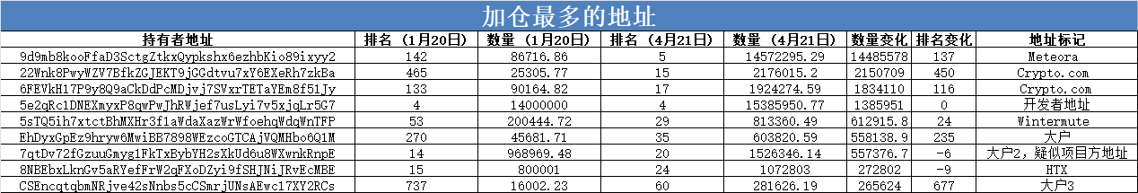截至4月21日的数据显示,前1000名地址持有的TRUMP代币数量约为98.51%,较1月20日的95.83%上升了3.68%。上述的数据说明,TRUMP的代币换手明显,且在低谷阶段似乎筹码变得更加集中。