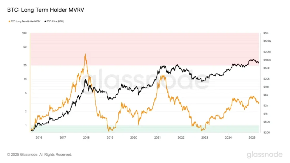 BTC 长期持有者 MVRV。资料来源:Glassnode