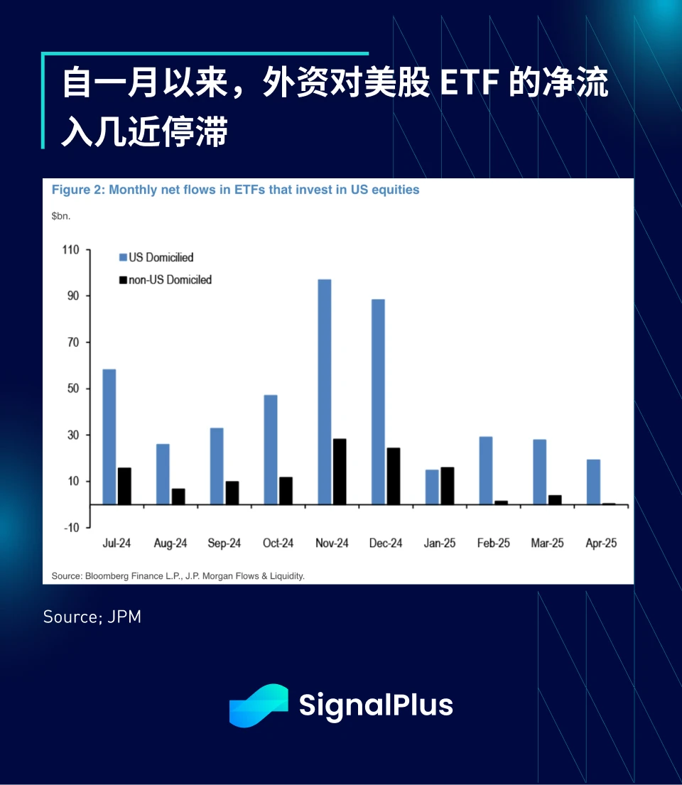 外国投资者对美股的配置也大幅放缓,过去三个月 ETF 的资金流入几乎归零。