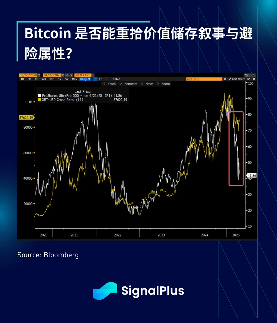 与美元脱钩可能会使 BTC 作为价值储存手段的长期多头叙事再度被市场关注。尽管我们过去一年也曾批评 BTC 越来越像一个高杠杆版的 Nasdaq 指数,但近期它终于开始展现出与股市脱钩的迹象。上周美股整体表现疲弱,但 BTC 价格仍逼近 9 万美元区间。