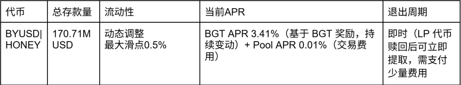注:Berachain 是一个高性能、EVM 兼容的 Layer 1 区块链,采用创新的流动性证明(Proof of Liquidity, PoL)共识机制,通过激励流动性提供者增强网络安全和生态活力。该产品为 BYUSD/HONEY 流动性池,部署在 Berachain 的原生 DEX BEX 上,HONEY 是 Berachain 的原生稳定币(多资产抵押,软锚定美元),BYUSD 为熊链上的另一种稳定币。