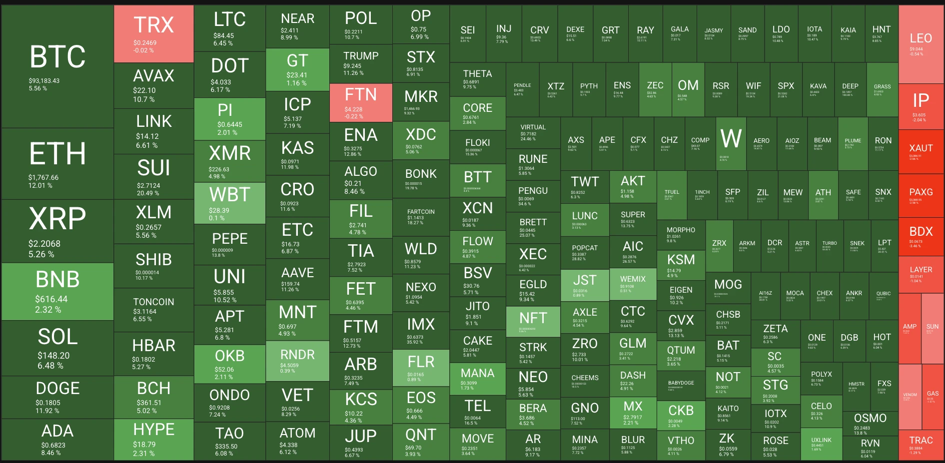 昨日晚间比特币上涨突破 90000 美元关口,现报 92925 美元,并于今日最高触及 94000 美元, 24 小时涨幅 6.37% ,创 3 月 3 日以来新高,同时比特币超越白银,排名全球资产市值排名第七位。其他山寨币也开启了上涨模式,根据 Quantify Crypto 数据,大部分市值前 200 的山寨币 24 小时都出现上涨,其中 ETH 涨幅超 12% ,SUI 涨幅超 21% 。