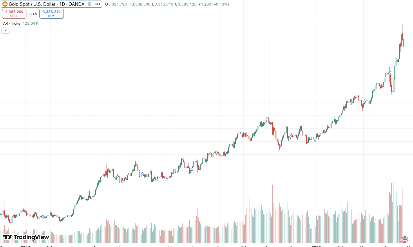 近一个月,特朗普关税等一系列政策引发全球市场动荡,投资者避险情绪高涨,资金首选配置老牌避险资产黄金。根据 TradingView 数据,黄金从 2025 年开始便一直处于上涨趋势中,昨日黄金触及 3500 美元/盎司,创下历史新高,目前黄金市值达 22.545 万亿美元。