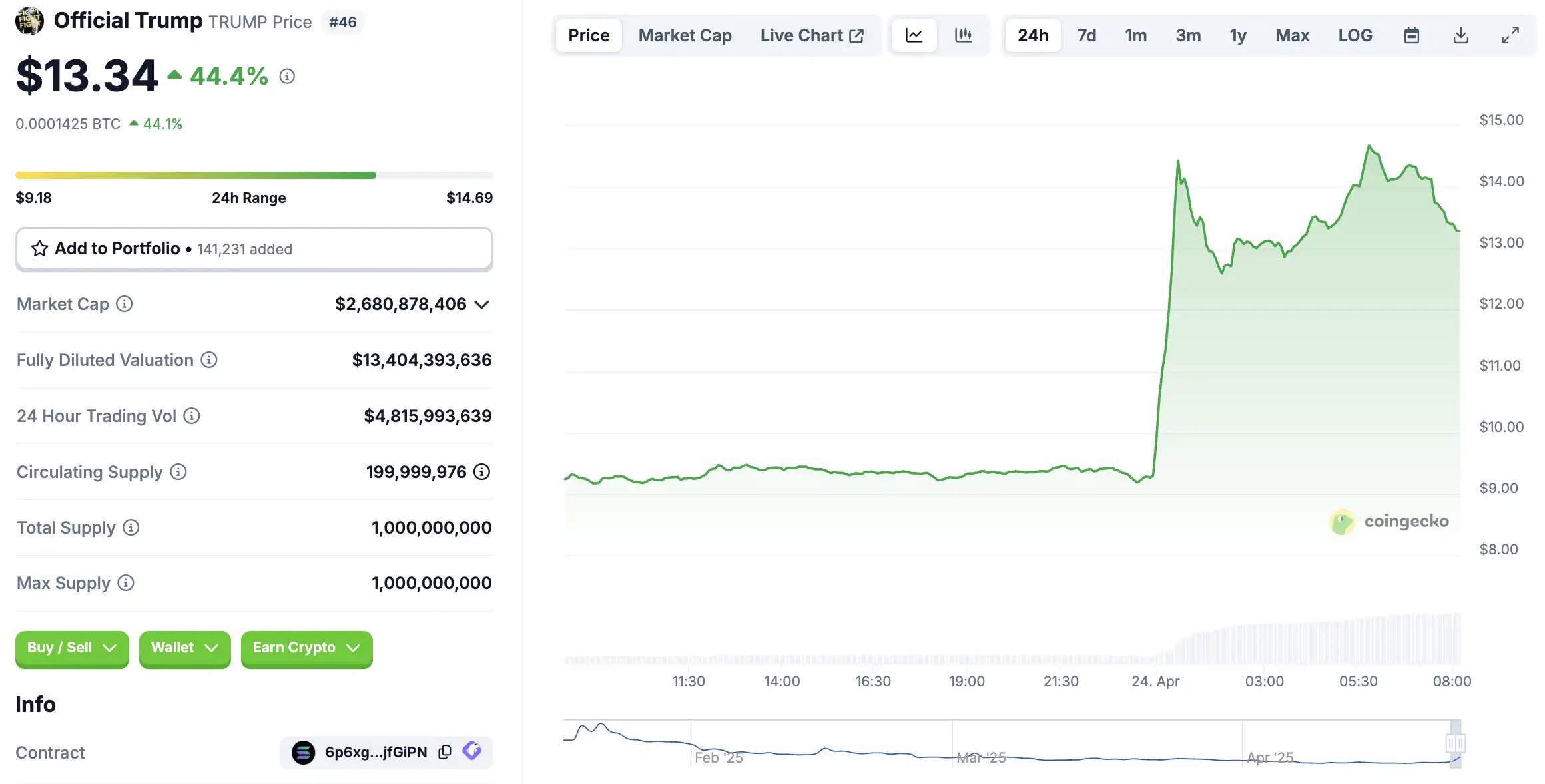 今天凌晨,TRUMP Meme 币官网突然宣布邀请前 220 大持币者共赴豪华晚宴。消息一出,迎来天量解锁价格一直在不到 10 美元徘徊的 TRUMP 直线拉升超 75% 后回落,截至撰稿时报价 13.34 美元。