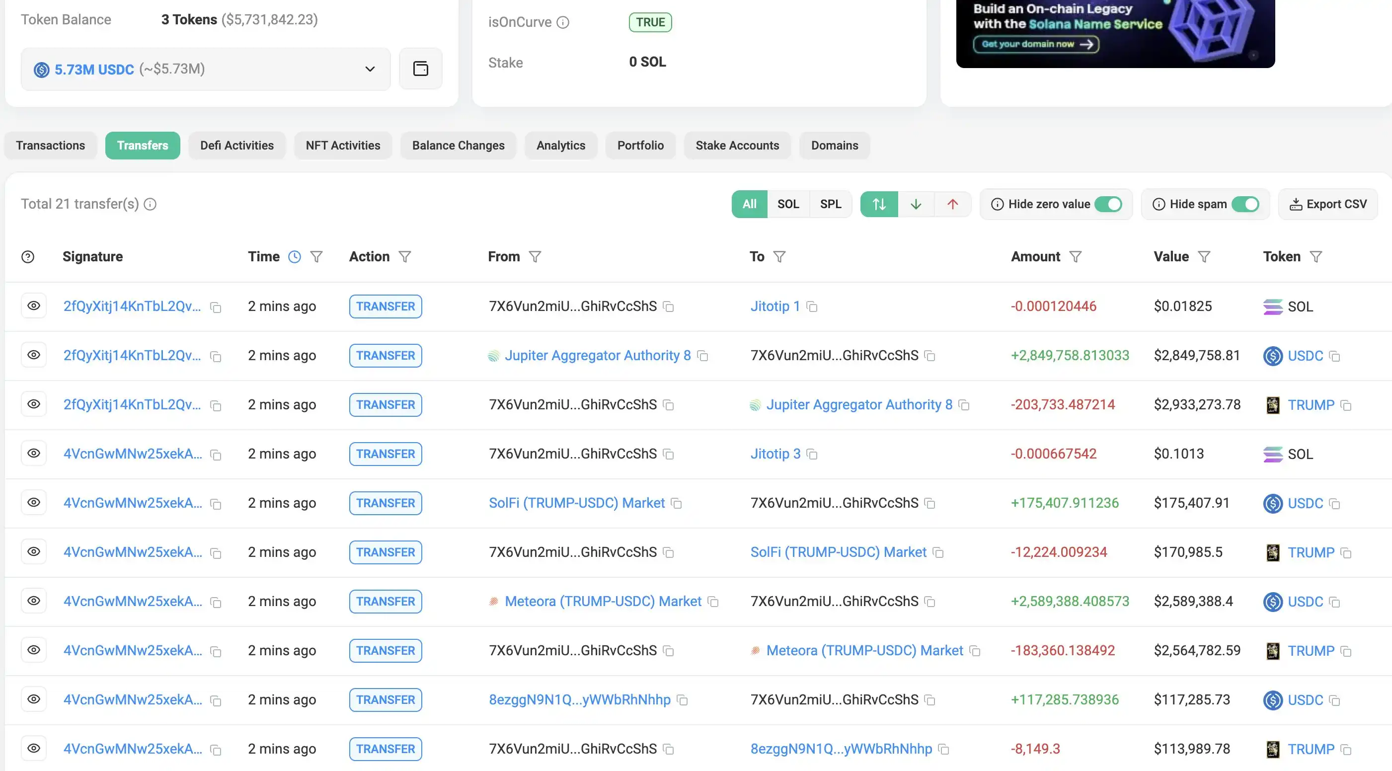 巨大波动的背后,投机者早已闻风而动。据 Lookonchain监测,一位神秘鲸鱼在晚宴消息发布后迅速出手,用 500 万美元购入 40.7 万枚 $TRUMP,仅 30 分钟后便以 573 万美元清仓,净赚 73.18 万美元,堪称精准狙击。而另一位巨鲸则在消息公布前抛售了 63 万枚 $TRUMP(约 548 万美元),却错过了后续 450 万美元的潜在利润。