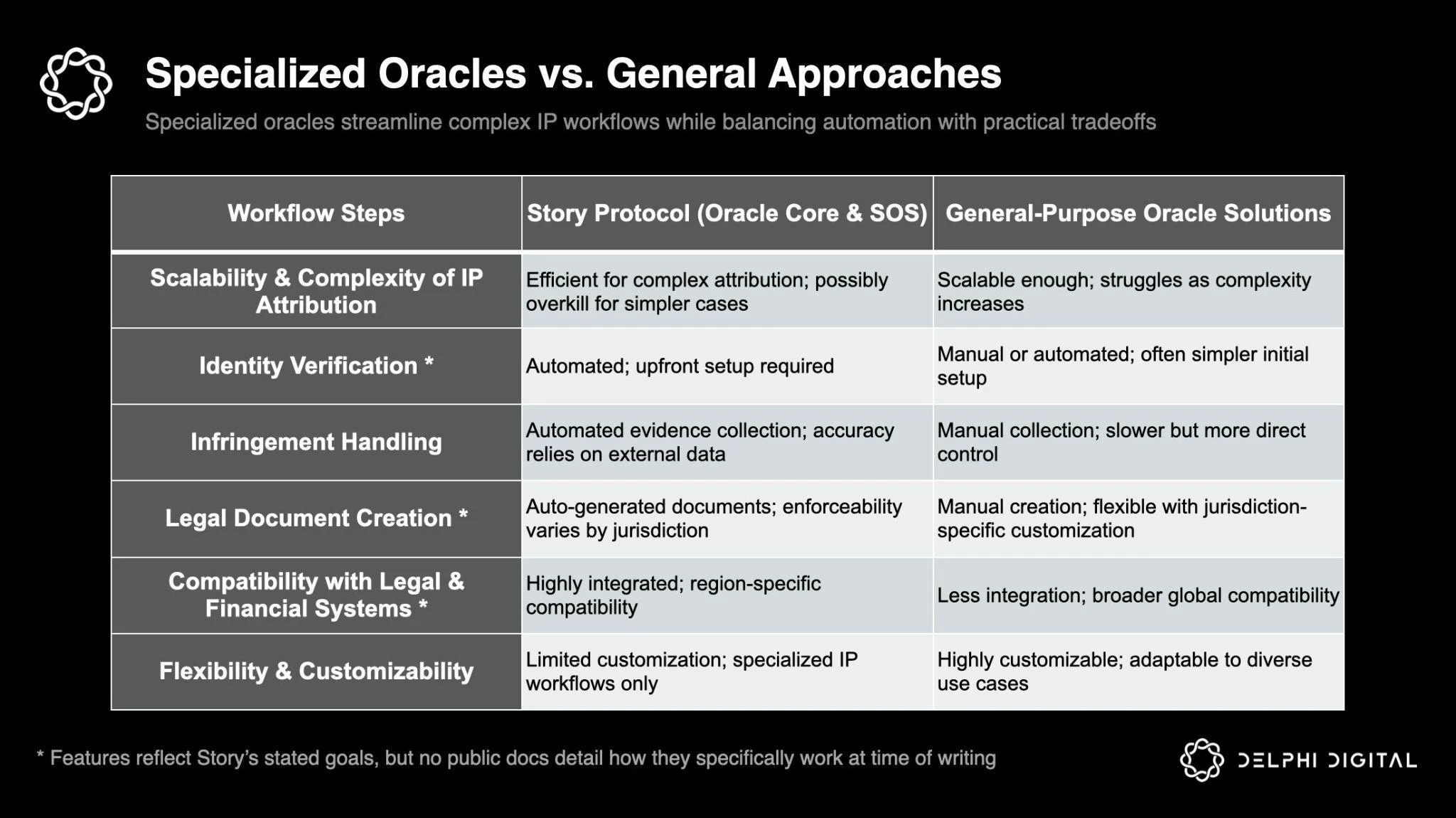 考虑到这一点,下方表格列出了 Story 的专用预言机框架与通用解决方案在关键 IP 流程中的差异。