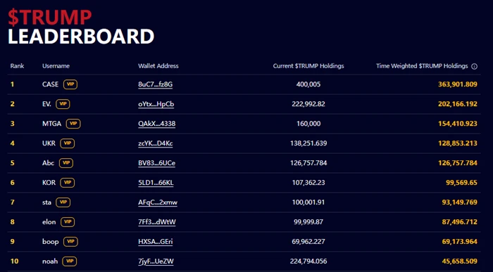 目前可以在 Meme 币 TRUMP 官方网站的排行榜上查看排名,排行榜在 4 月 23 日至 5 月 12 日整个持币期间每小时更新,平均 TRUMP 余额将决定排名。5 月 12 日排名前 220 位的 TRUMP 持币者(自 4 月 23 日以来的平均持币量)将锁定与特朗普总统共进晚宴的席位,而前 25 名将获得与特朗普 VIP 招待会以及特别安排的白宫参观机会。据 TRUMP Meme 官网披露数据显示,“TRUMP 晚宴”时间加权排名前 25 的 TRUMP 代币持有地址总持仓量已超 200 万枚,目前触及 2, 099, 122 枚。