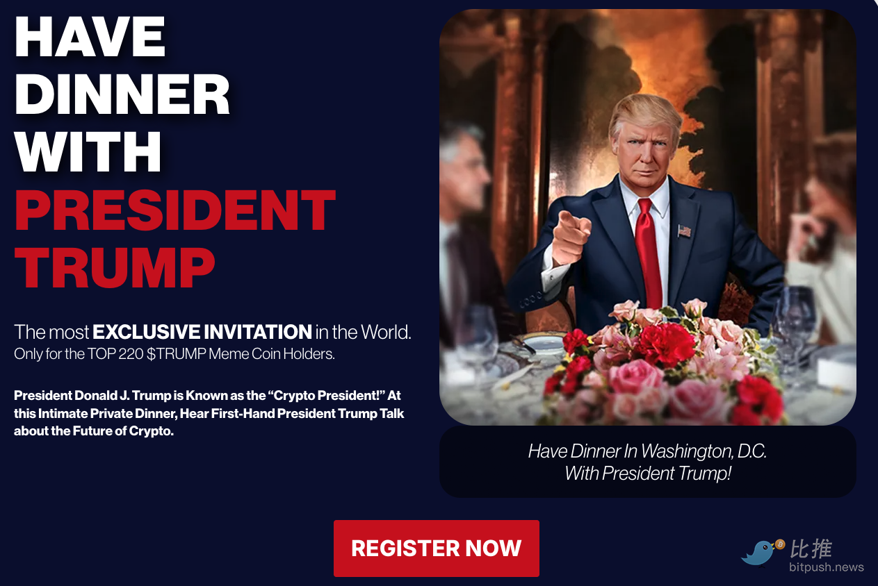 「与特朗普总统及 TRUMP 社区共进晚餐!」邀请函写道,「让总统知道你持有多少 TRUMP 社区共进晚餐!让总统知道你持有多少 TRUMP 币!」