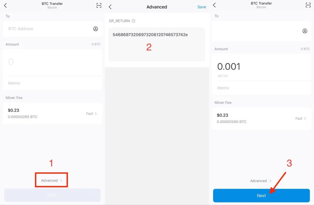 再以 imToken 钱包为例,进入 BTC 钱包转账界面,打开“高级模式”。在“OP_RETURN”输入框中输入十六进制信息。点击“下一步”完成交易信息确认,输入交易密码就能成功发送带有 OP_RETURN 信息的交易,请确保“输入金额 = 输出金额 + 矿工费”。