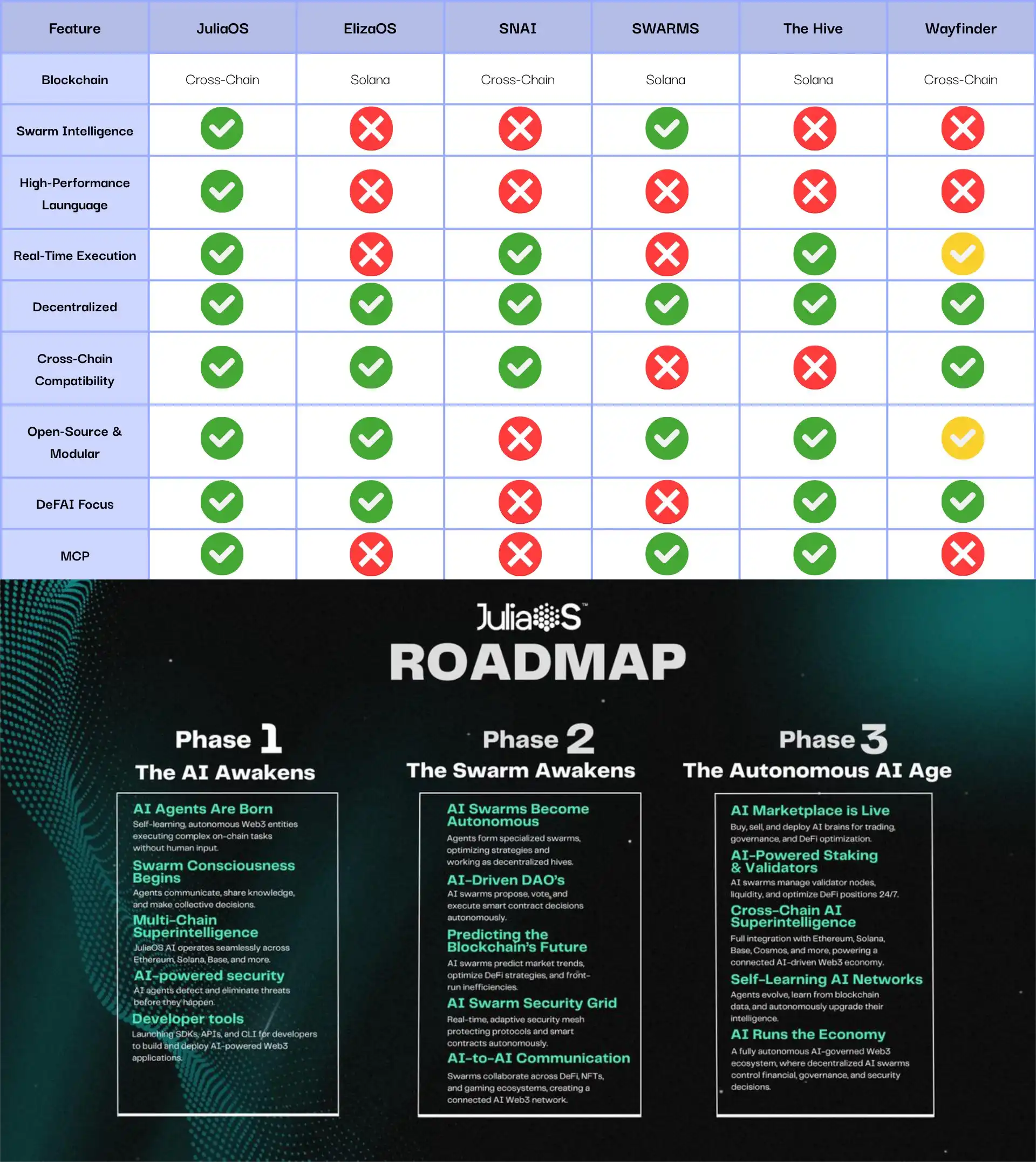 社区还「贴心」的准备了自己与其他 Swarm 类项目技术层面对比,现在可以得知该 框架 现在可以支持的多链包括 ETH、Polygon、Arbitrum、Optimism、Base、Solana 等一系列主流链以及 Llama、Gemini、Mistral 等主流大模型。