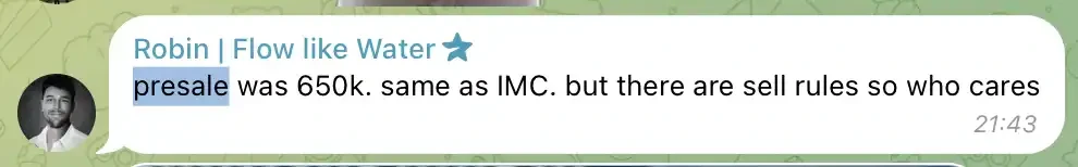 ALT 认为几乎没有一种方式能让所有类型的投资者都满意,而为了项目发展他已经选择了对一个正规项目最适合的路径。我们可以在社区中得知对这些社区的预售市值价格是跟代币发射时的 IMC「初始市值」相同且有一定的贩售限制,团队宣称对每个出售的代币地址都进行了监控,以便随时应对。