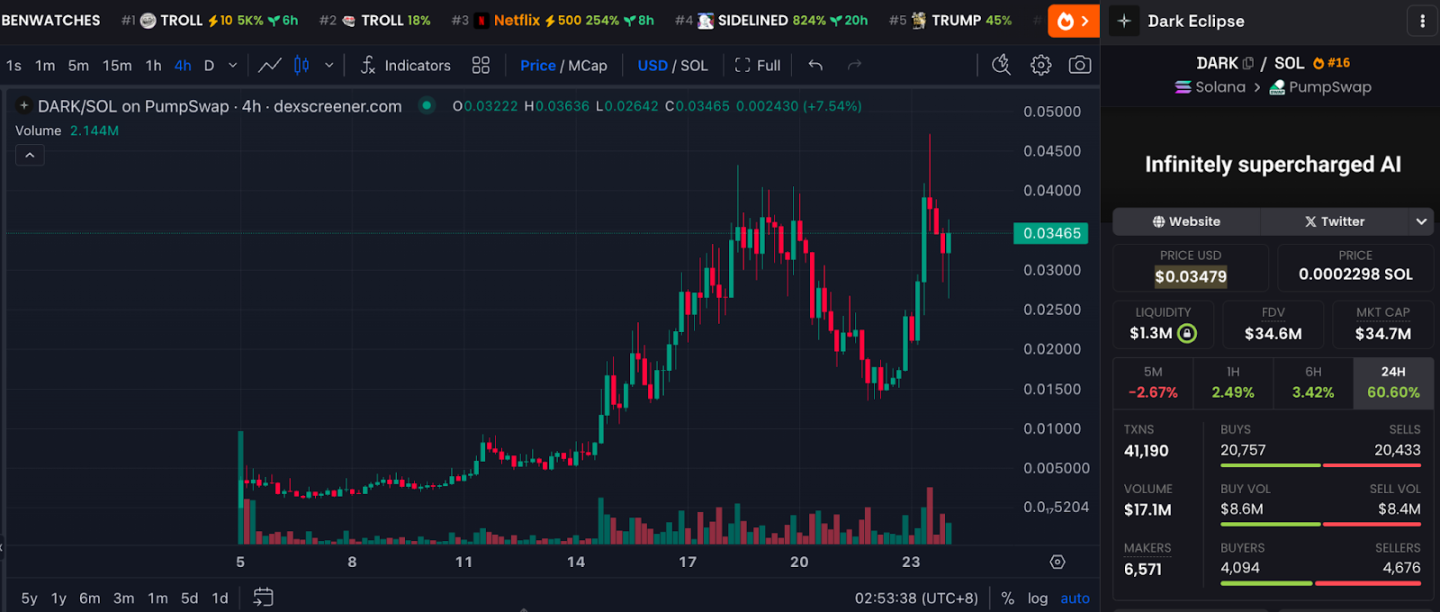 如果你最近关注加密市场,可能已经注意到 $DARK 的惊人表现:在美国 SEC 新任主席释放加密友好信号的背景下,市场全面回暖,而作为 Solana 生态的 AI Meme 项目,$DARK 成为了这一轮涨势的领跑者。