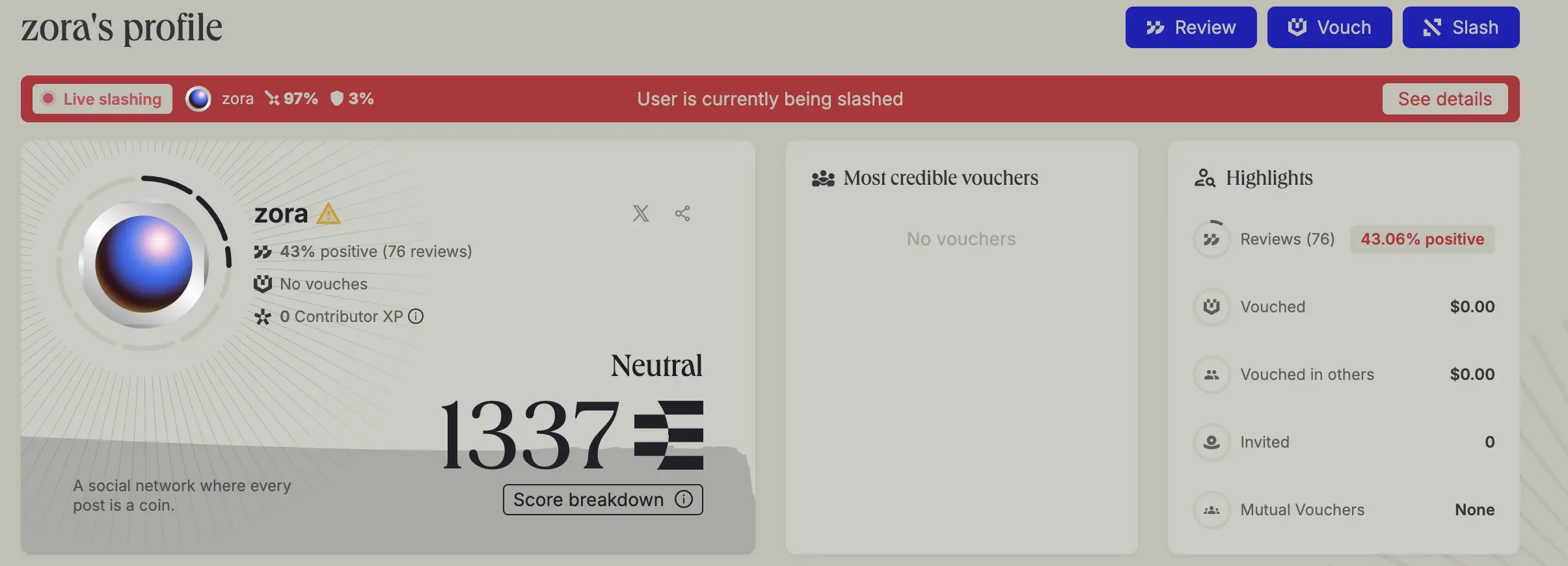 在多重失望情绪叠加下,Ethos 的差评功能被视为情绪价值的宣泄渠道,社区用户纷纷留下「差评」,导致 Zora 的可信度评分快速下降。不少用户直言,「链上记录不可更改,作恶项目要载入史册」。