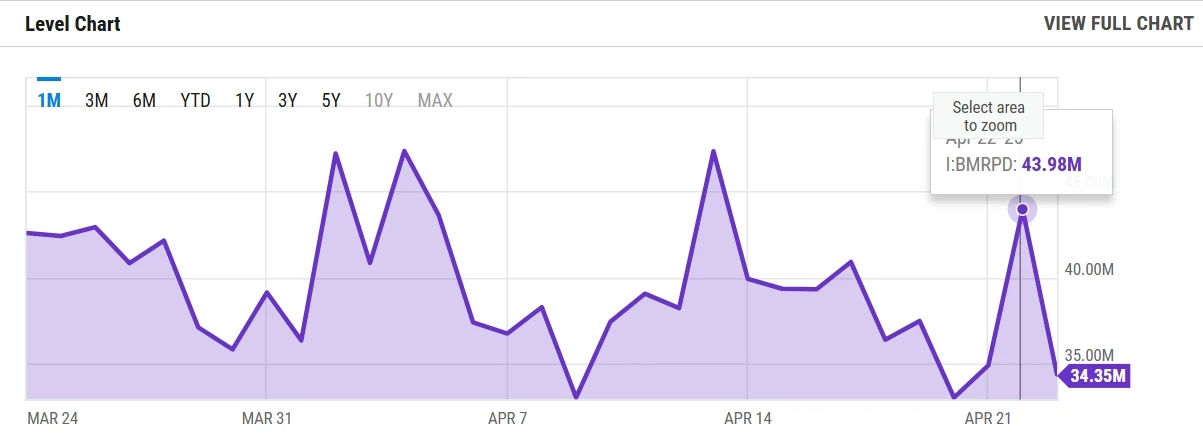 根据 YCharts 的数据,本周比特币矿工的每日总收入(包括区块奖励和交易手续费)如下: 4 月 19 日: 37.46 百万美元;4 月 20 日: 33.00 百万美元;4 月 21 日: 34.87 百万美元;4 月 22 日: 43.98 百万美元;4 月 23 日: 34.35 百万美元。从趋势来看, 4 月 22 日矿工收入曾短暂上扬至 43.98 百万美元,达到本周高点,但在 4 月 23 日迅速回落至 34.35 百万美元,日内降幅达到 21.9% ,显示矿工收益波动性加剧。此外,相较于 2024 年同期的 65.64 百万美元, 4 月 23 日的总收入同比下滑 47.7% 。