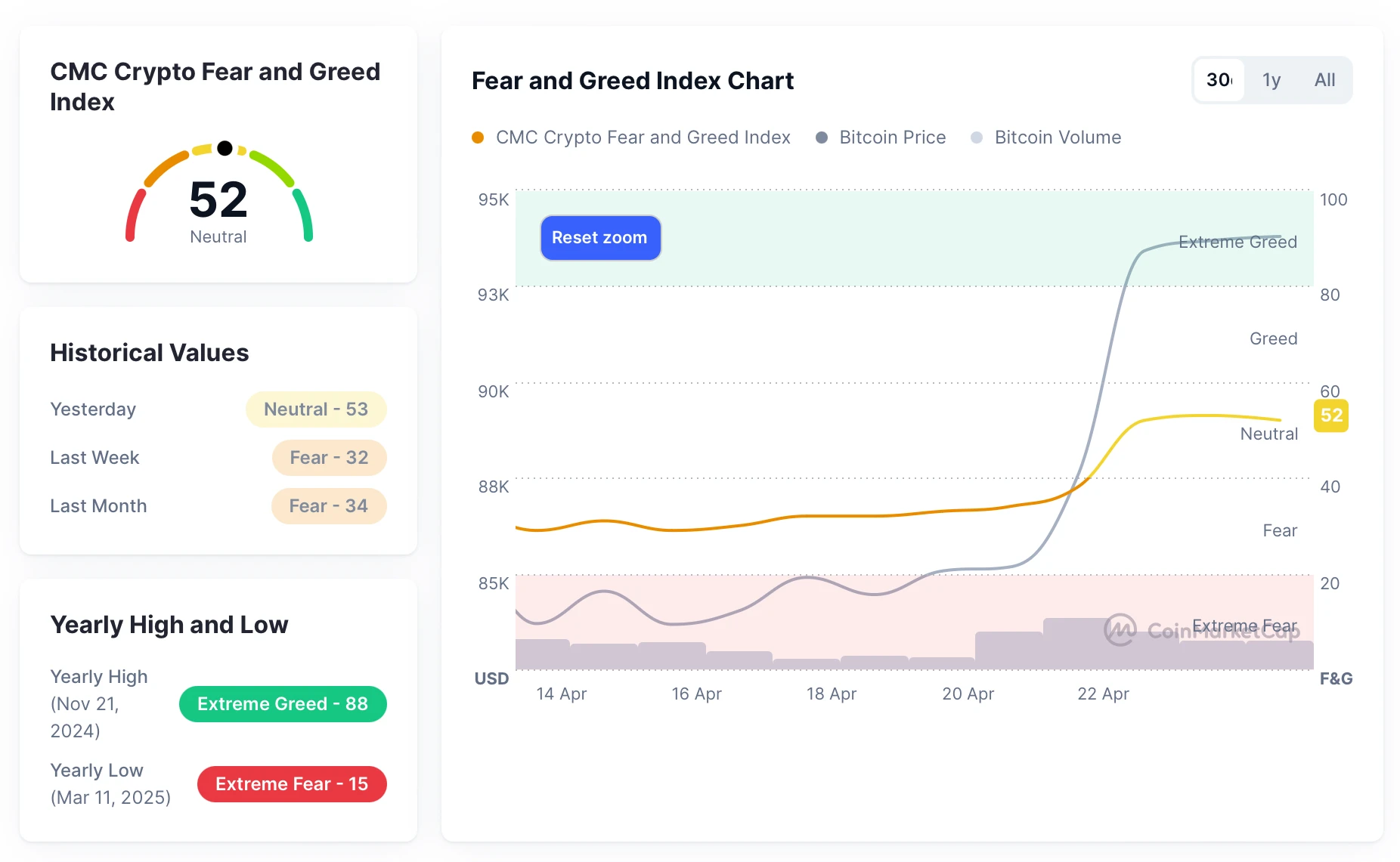 根据 CoinMarketCap 数据,截至 4 月 25 日,恐惧与贪婪指数(Fear & Greed Index)为 52 ,处于“中性”区域,表明市场情绪已从前期的恐慌中恢复。本周指数呈现明显回升趋势: 4 月 21 日: 34 (恐惧);4 月 22 日: 38 (恐惧边缘);4 月 23 日: 52 (情绪快速好转);4 月 24 日: 53 (接近“贪婪”区间)。情绪指标的持续上升与价格的同步走强相互印证,显示市场正逐步脱离悲观预期,短期内或具备继续反弹的基础。