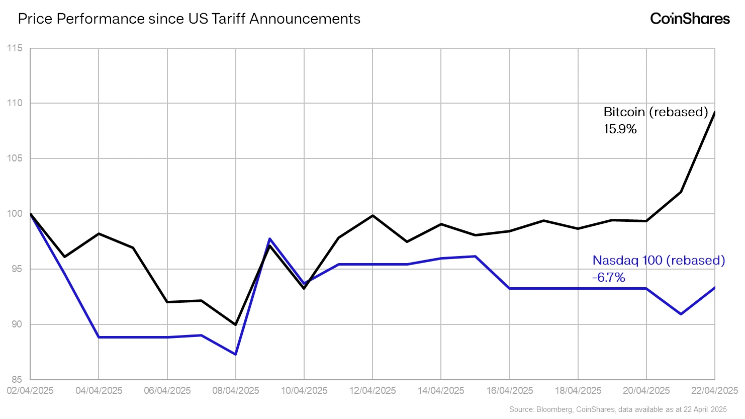 4 月 23 日消息,CoinShares 研究主管 James Butterfill 在 X 平台发文称,自美国 2 月 2 日“解放日”关税公告发布以来,比特币的表现已超出纳斯达克 100 指数 15.9% ,凸显出其作为去中心化投资资产的优势。