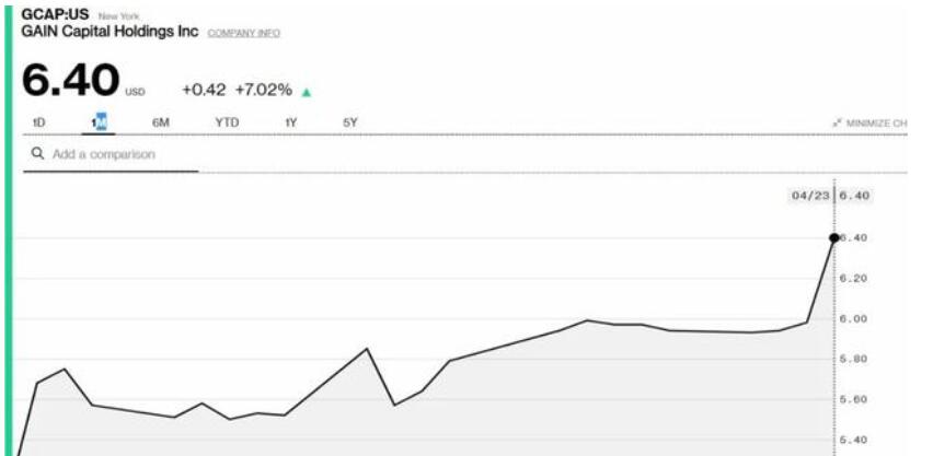 得益于靓丽的财务数据,嘉盛集团股价隔夜上扬7.02%,在13个月高点附近交投,收报6.40。今年2月28日,美国知名证券和商品经纪商INTL FCStone宣布,已与嘉盛集团达成最终收购协议,将以每股6美元的全现金交易收购嘉盛,股权价值大约2.36亿美元。受此影响,嘉盛集团股票暴涨超过60%。