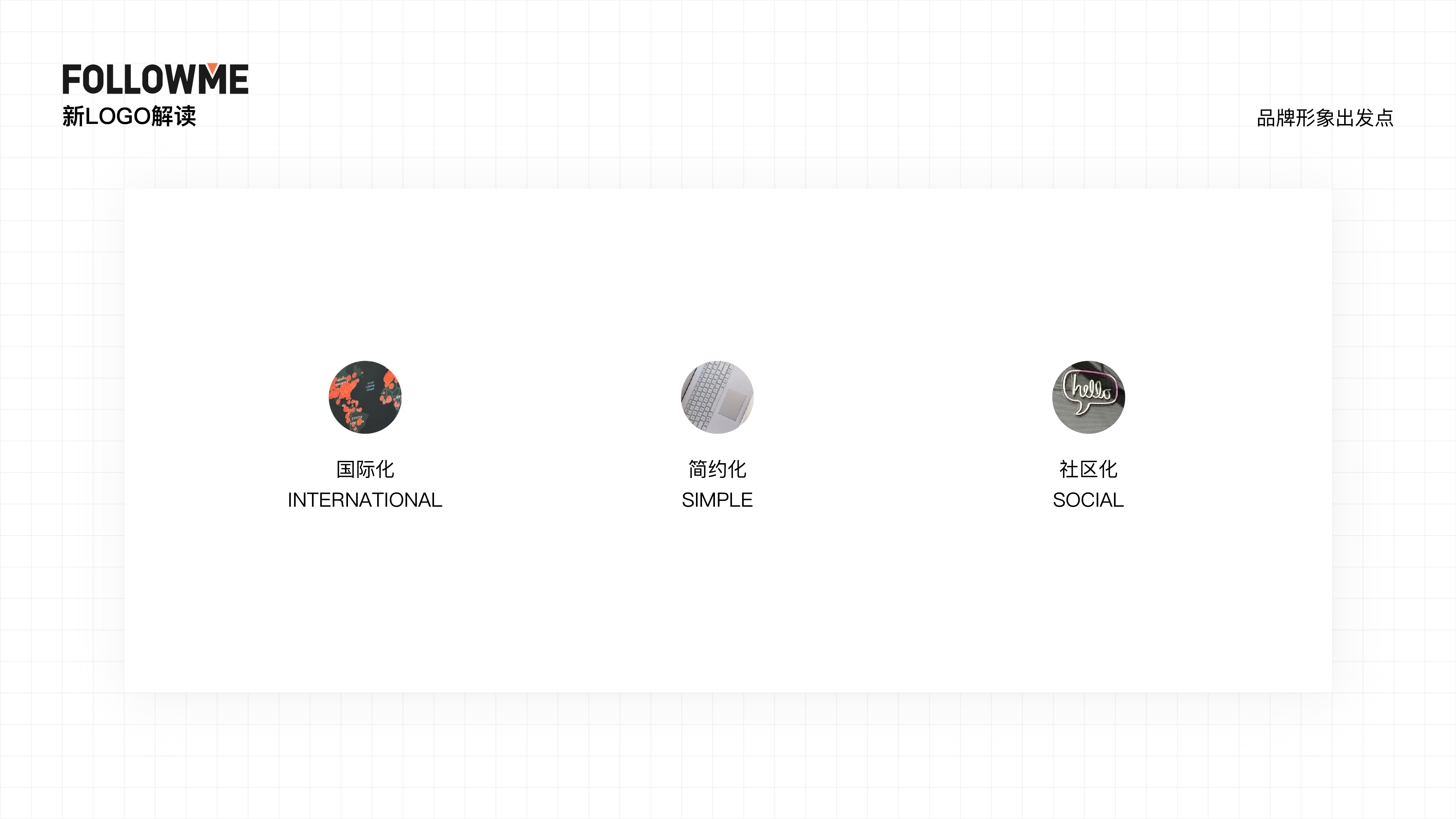 本次FOLLOWME 品牌形象升级,是在FOLLOWME 全球化战略与5周年的背景下,以“从新出发、全新体验、用心服务”为出发点,设计师从国际化对应战略角度,简约化对应设计角度,社区化对应用户角度3个方向,提炼出3个核心提升点ISS(ISS:International 国际化, Simple 简约化,Social 社区化)。