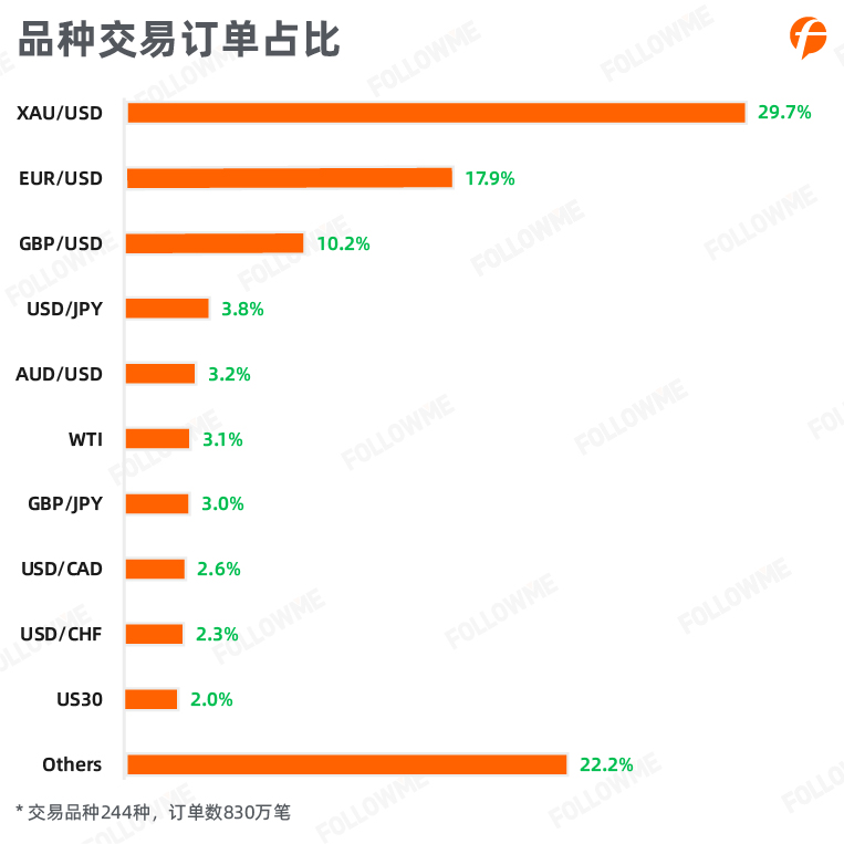 FOLLOWME 交易社区2020年上半年交易者共交易过包含外汇货币对、贵金属、原油、指数等在内的244个交易品种,其中交易订单数量最多的是 XAU/USD,占比高达29.7%,遥遥领先,其次是 EUR/USD 和 GBP/USD,占比分别为17.9%和10.2%,热门交易品种 TOP 10的交易订单数占总订单数的77.8%。从品种分类占比来看,244个交易品种中,外汇占60%,贵金属占30%,原油和指数各占5%。
