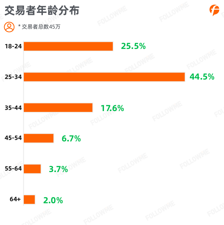 从年龄层面上看,25-34岁是交易者的主力年龄段,约占45%;其次是18-24岁的交易者,约占25.5%,这种情况表明外汇投资者呈现出年轻化的趋势,其中以下三个为主要原因:一,思想观念的转换。相比长辈,现在年轻人更容易接受外汇投资这种理财方式,并且涌现出了很多创业英雄,他们早早就实现了财务自由,这是很多年轻人都向往的。二,年轻人受教育程度普遍提高。受教育程度跟理财投资几乎可以说是成正相关的。三,年轻人的收入普遍提高。比如一些大型互联网公司的普通员工月薪都在万元以上,在满足基本生活开支后,仍有剩余的钱用来投资,所以收入提高也是外汇投资者年轻化的重要原因。
