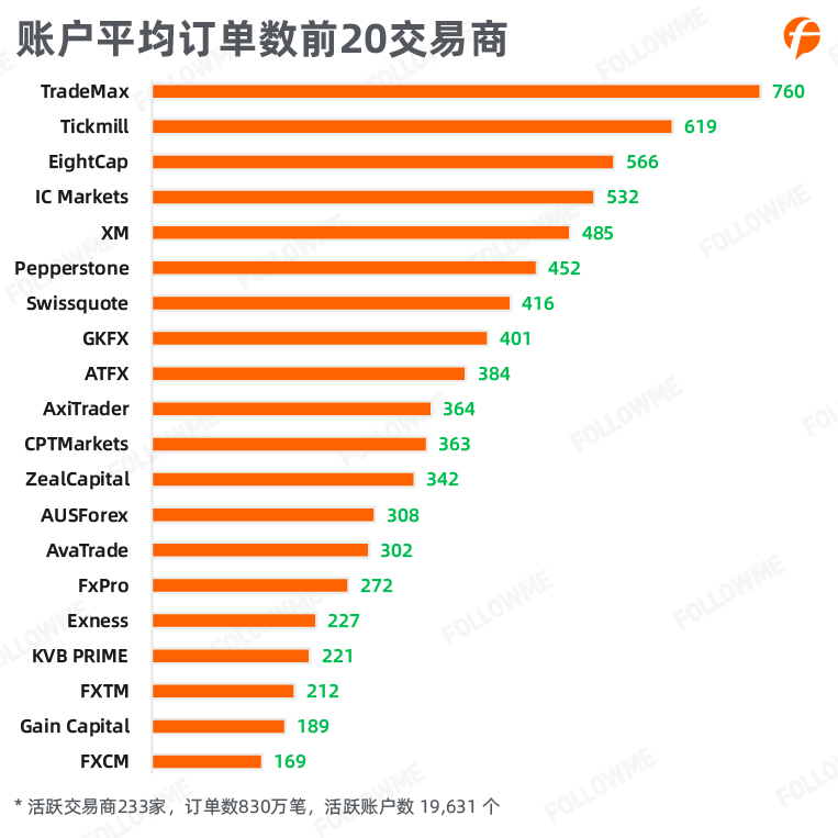 2020上半年,FOLLOWME 交易社区活跃交易商共有233家,连接账户数近20,000个,成交了830万笔订单,交易账户平均订单数424笔,其中账户平均订单数前20的交易商均在160笔以上,最高者多达760笔。